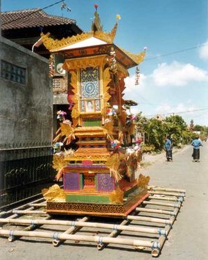 Das wichtigste Fest für einen Balinesen findet nach seinem Tod statt. Da der Tod nichts Endgültiges markiert, sondern nur den Übergang von einer Existenz in eine hoffentlich bessere darstellt, ist die Verbrennung ein fröhliches Fest. Ein Verbrennungsturm, dessen Form von der Kastenzugehörigkeit abhängt, wird in Auftrag gegeben. Verwandte und Bekannte reisen von überall her und der Zeremonietag beginnt mit einem üppigen Festmahl.