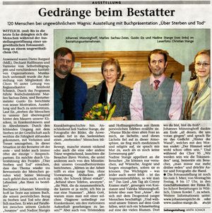 Nicht Sargnagel – es wären ohnehin Schrauben -, sondern Sargtulpen, nicht Totenzettel, sondern Trauerbilder, nicht Leichenwagen, sondern Bestattungskraftwagen, und der ist nach einer DIN gebaut. Schließlich darf nur der Bestatter Verstorbene transportieren, und der muss strengstens auf die Hygiene achten. Zuvor jedoch braucht er das Feingefühl von Psychologen. "Wir trainieren das Beratungsgespräch mit den Angehörigen", berichtet Guido Eis. In kürzester Zeit müssen sie zahlreiche Entscheidungen treffen und stoßen dabei an die Grenzen ihrer Belastbarkeit. Behutsam führt der Bestatter sie durch das Labyrinth der Möglichkeiten, denn: "Das Recht am Verstorbenen haben die Angehörigen." Wo und wie aufbahren, im verschlossenen Sarg, hinter Glas in der Leichenhalle, in einem wohnlichen Raum beim Bestatter oder, ganz intim, wie früher im eigenen Haus? See-, Urnen- oder Erdbestattung, Bestattung im Boden oder in den, aus südlichen Ländern bekannten, vielstöckigen Kolumbarien?